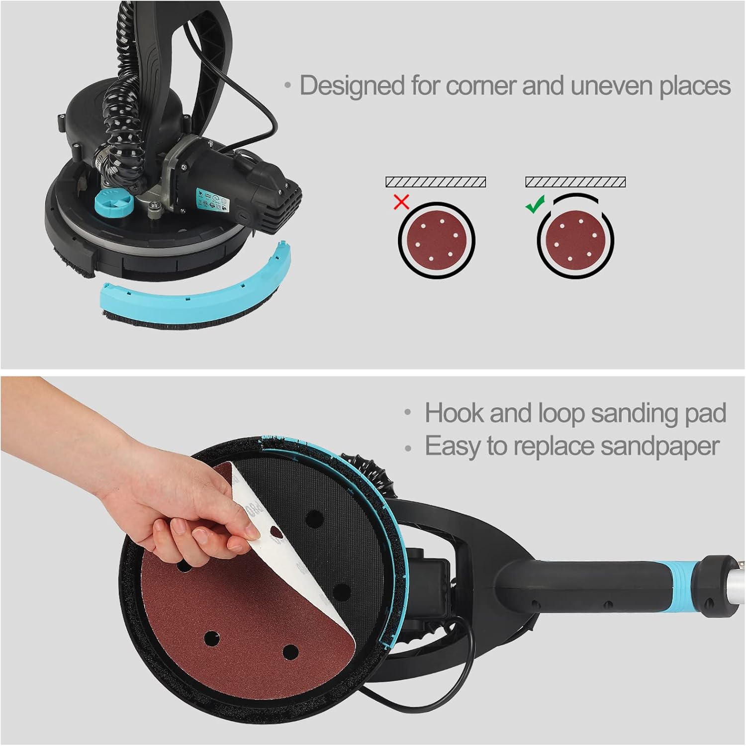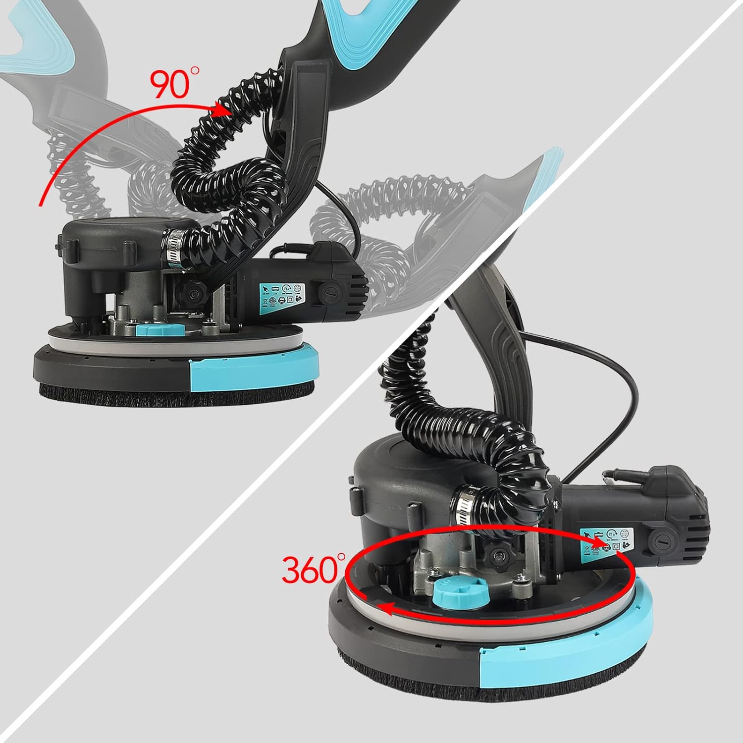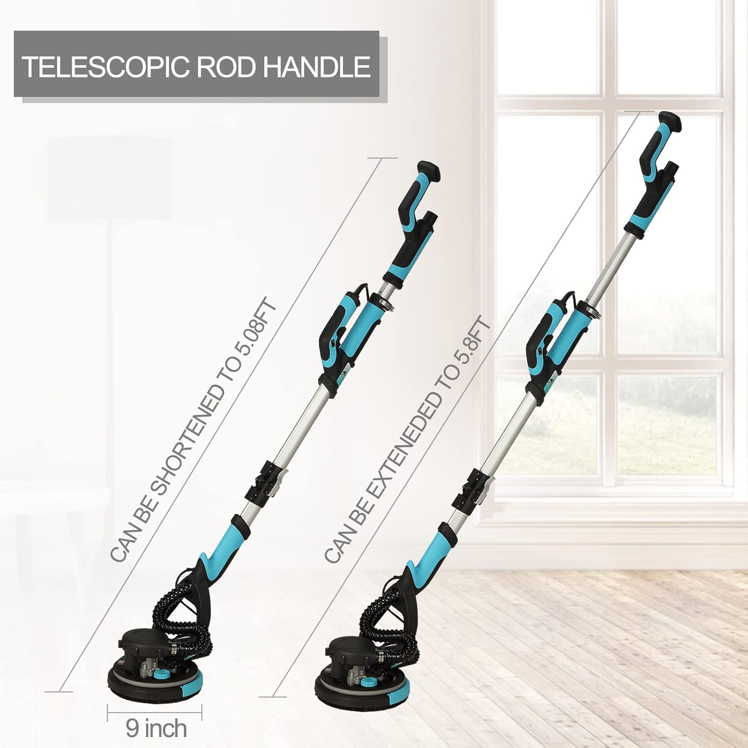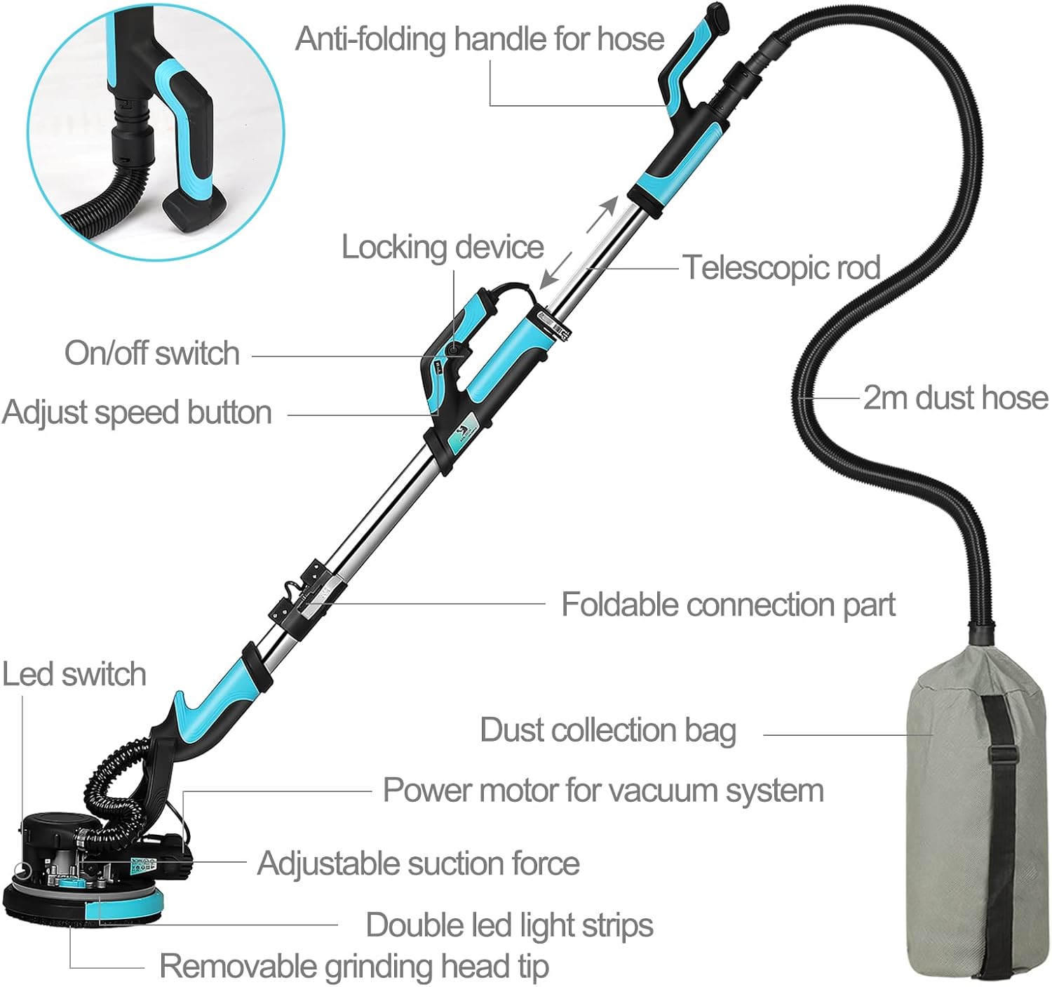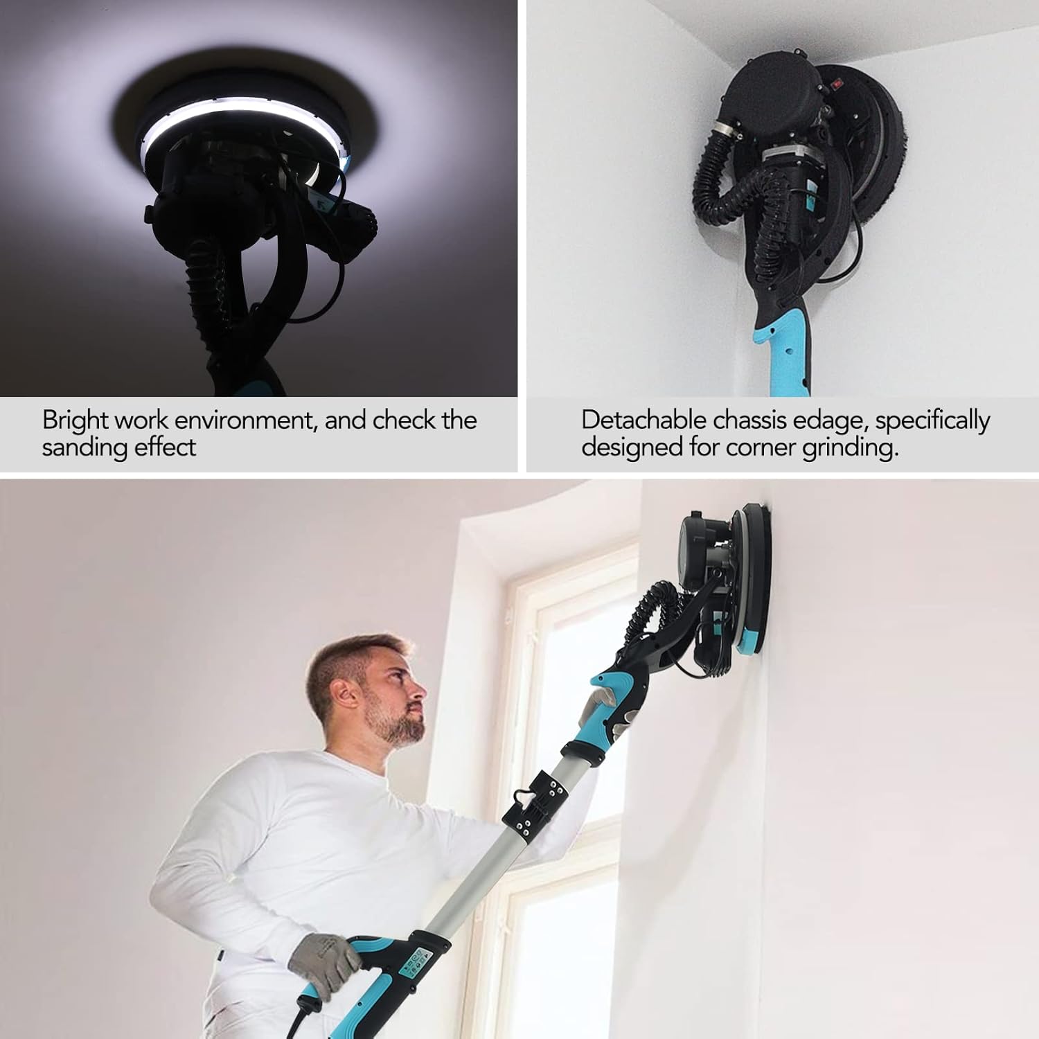 El cabezal giratorio de 360° y desmontable facilita el acceso a esquinas, bordes y techos, logrando un lijado uniforme incluso en zonas difíciles. El poste telescópico ajustable y la iluminación LED integrada aportan comodidad, precisión y mejor control en espacios oscuros o elevados.