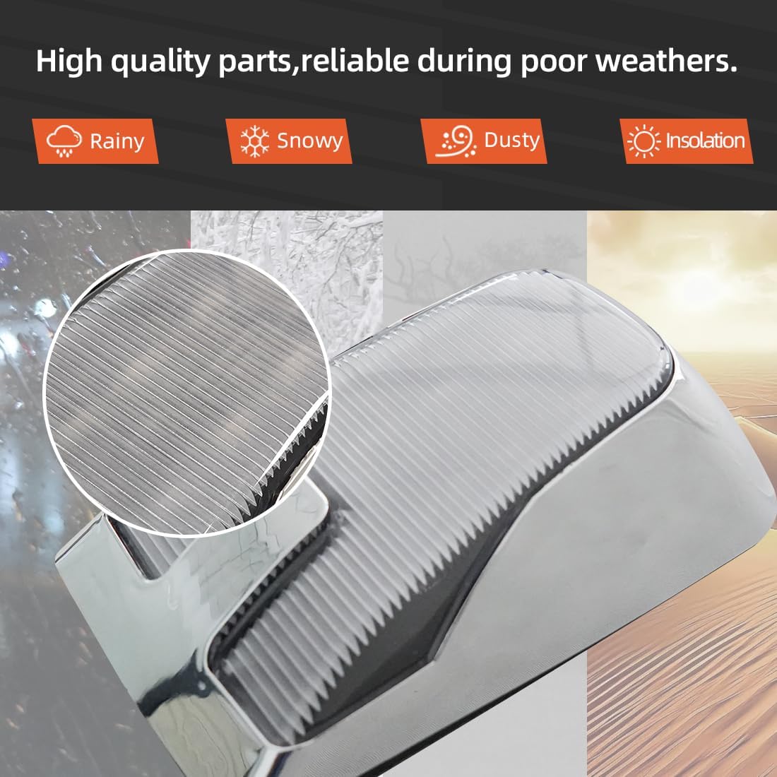 La carcasa cromada y la lente de acrílico transparente sellada cuentan con protección IP67 contra agua y polvo, evitando la acumulación de humedad y reduciendo el riesgo de corrosión o fallas prematuras. Además, incluyen resistencias integradas que ayudan a prevenir parpadeos o errores en el tablero del vehículo.
