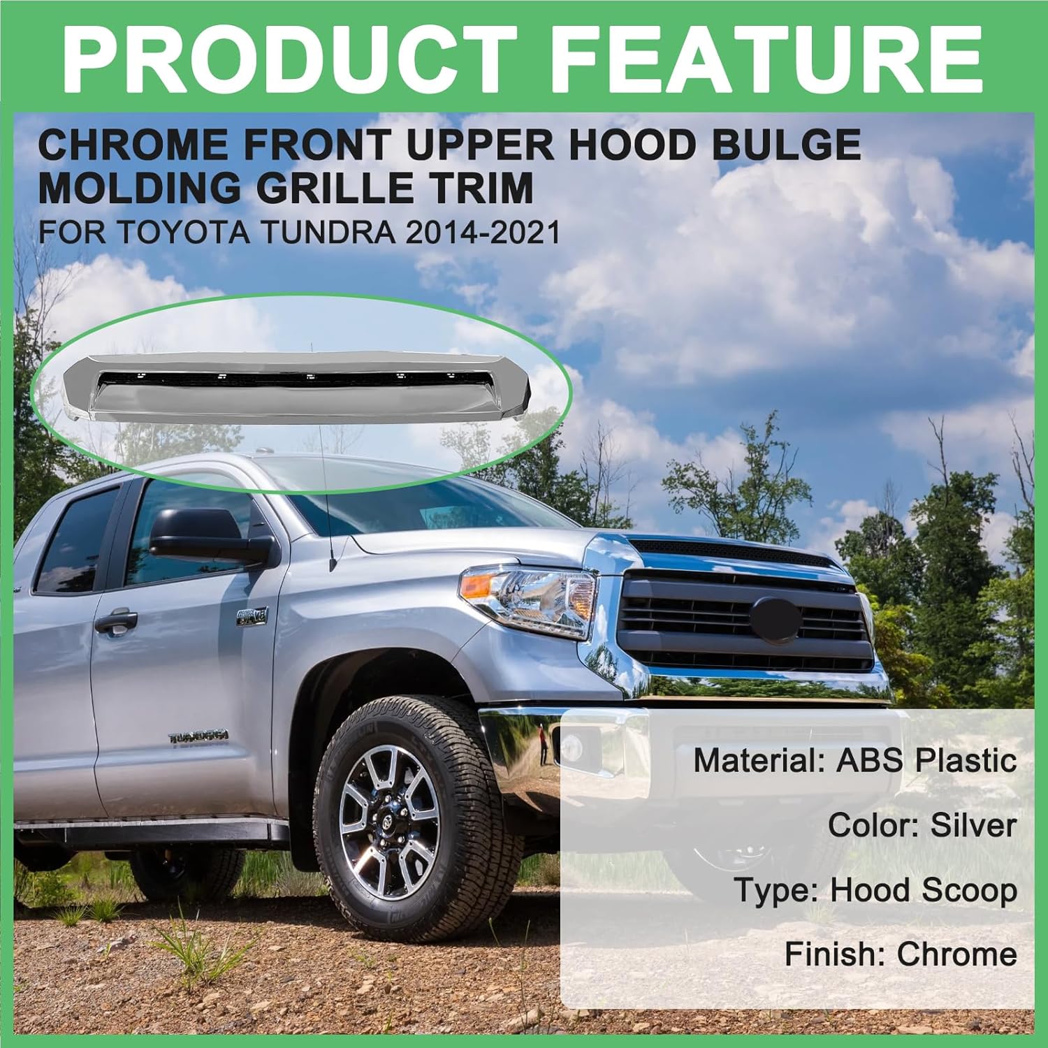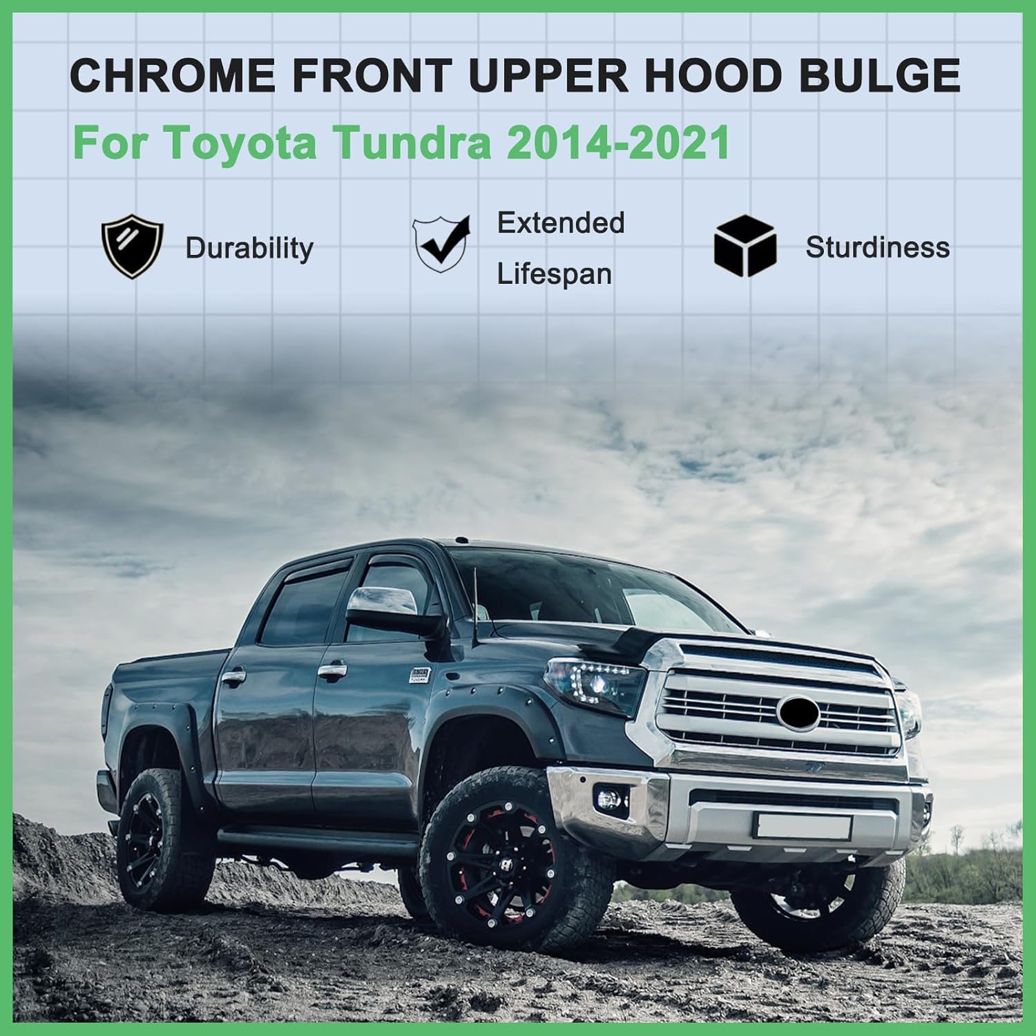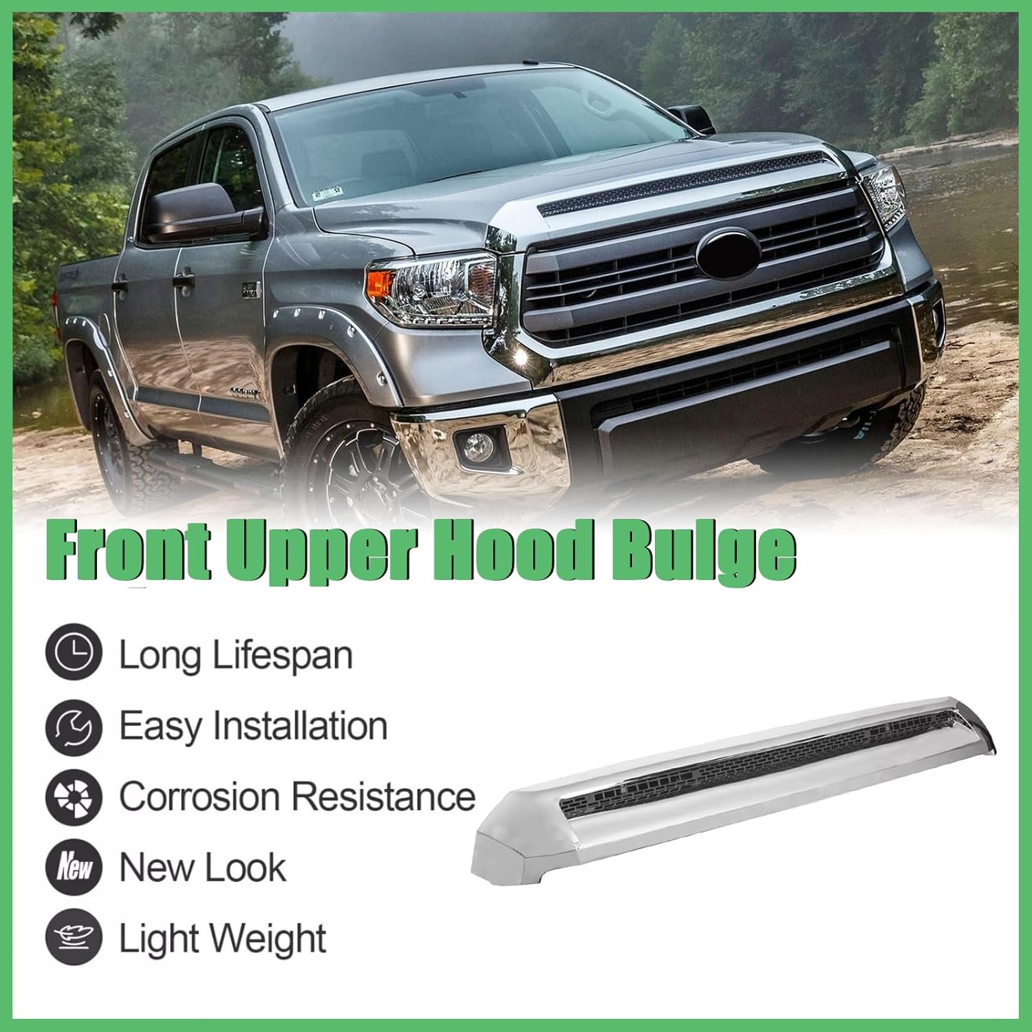La rejilla superior delantera Hood Bulge de MATMACRO está diseñada para mejorar la apariencia y funcionalidad de la camioneta Toyota Tundra modelos 2014 a 2021. Este accesorio tipo moldura de abultamiento de cofre estilo Platinum ofrece un diseño moderno y elegante con acabado cromado plateado que realza el frente del vehículo.
