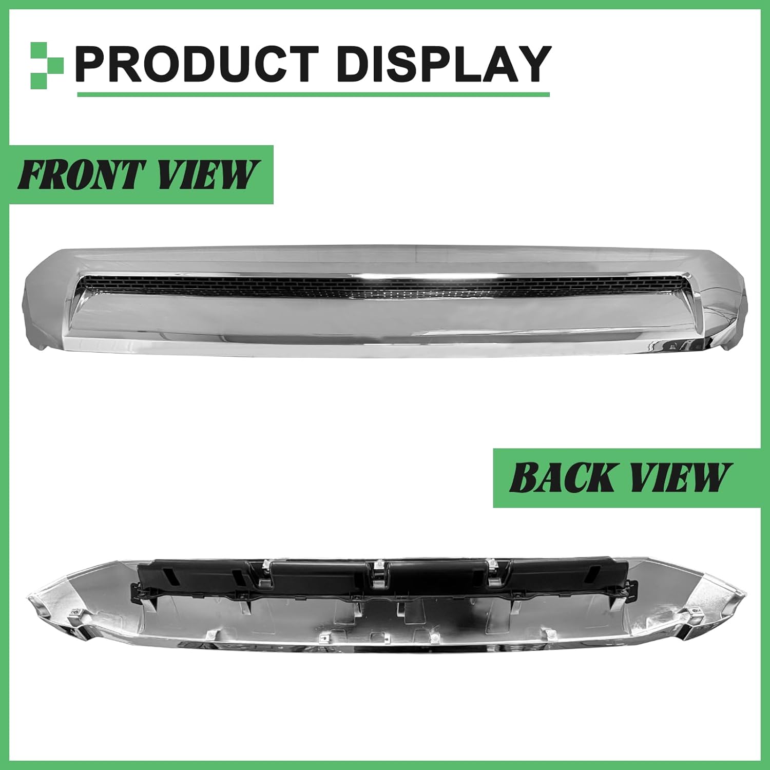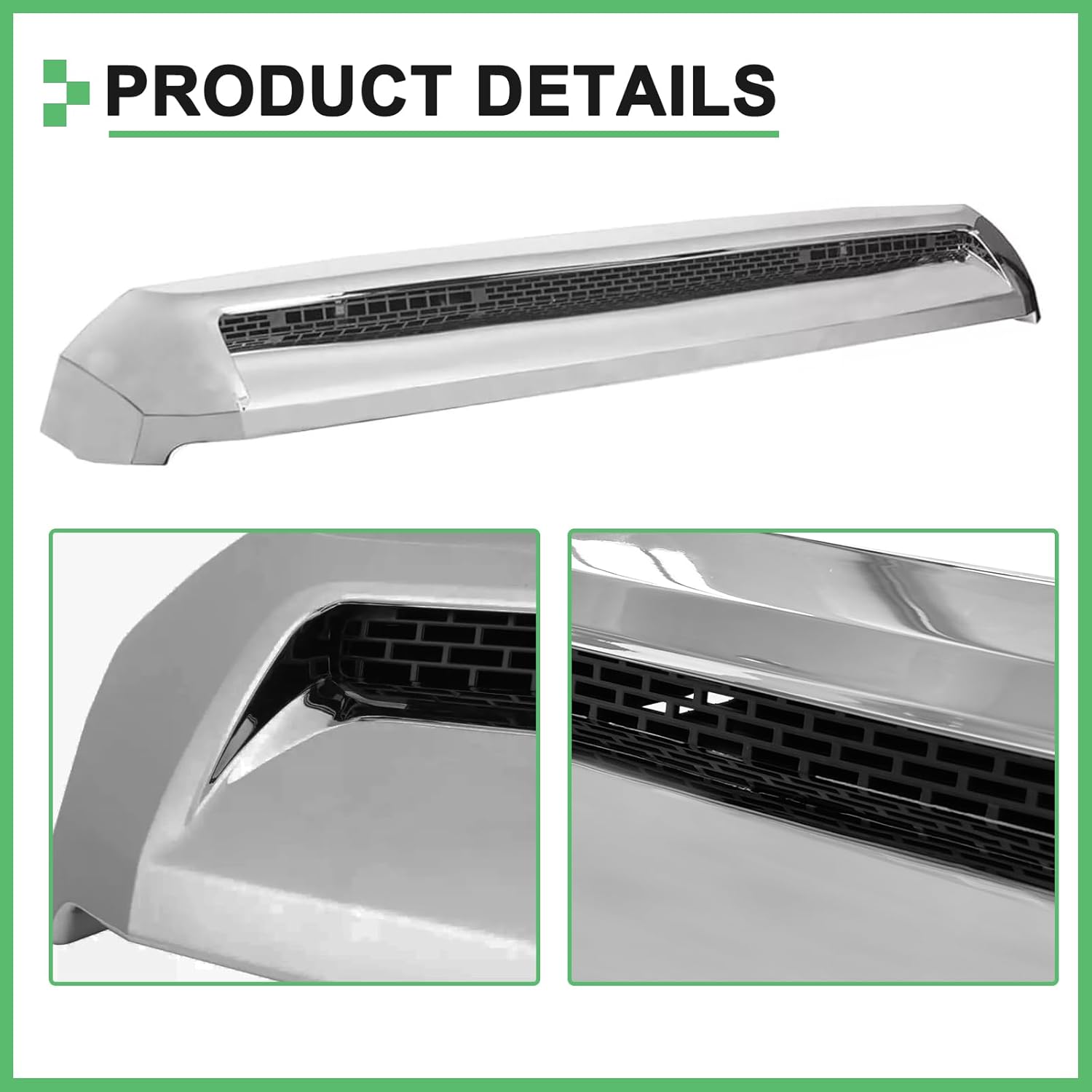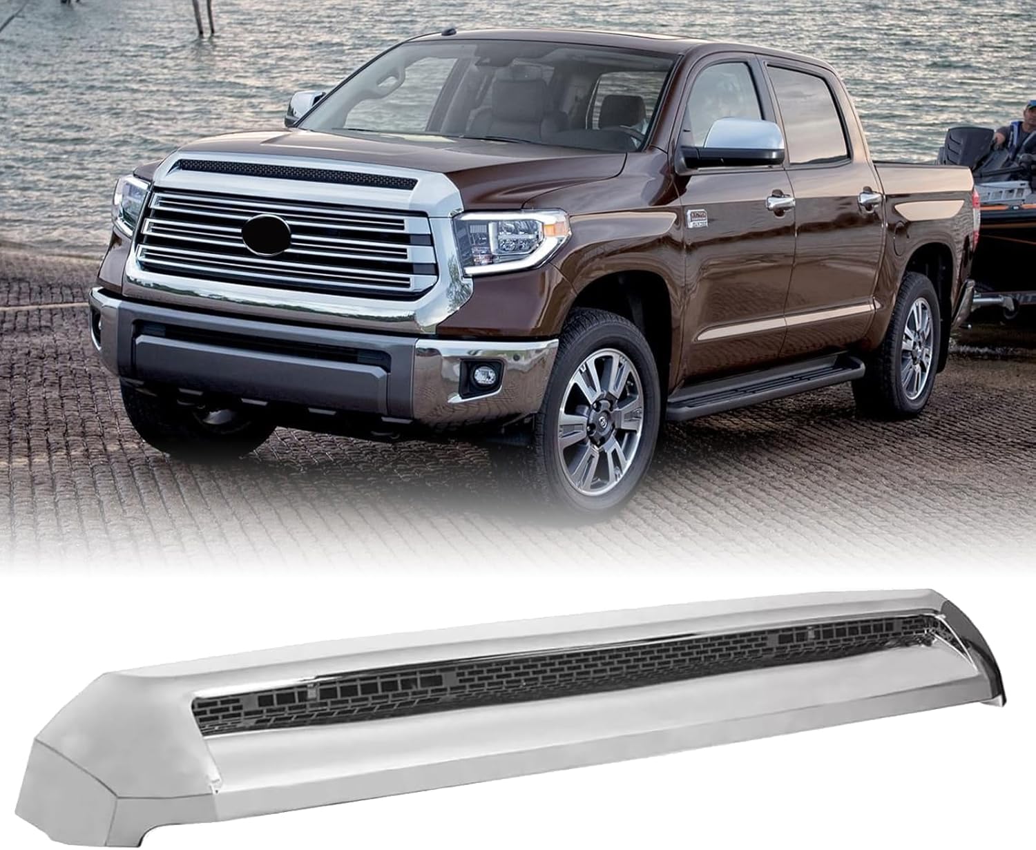 La rejilla superior delantera Hood Bulge de MATMACRO está diseñada para mejorar la apariencia y funcionalidad de la camioneta Toyota Tundra modelos 2014 a 2021. Este accesorio tipo moldura de abultamiento de cofre estilo Platinum ofrece un diseño moderno y elegante con acabado cromado plateado que realza el frente del vehículo.